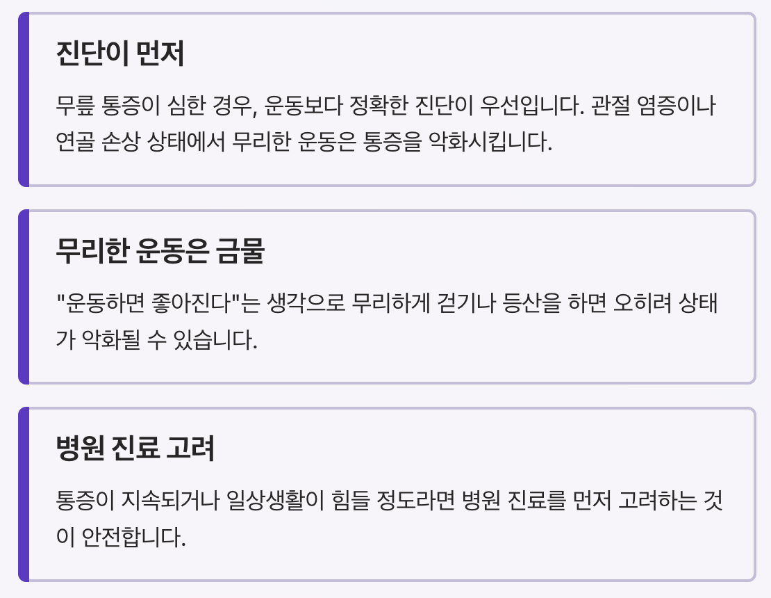 특히 “운동하면 좋아진다”는 생각으로 무리하게 걷기나 등산을 하는 경우, 오히려 상태가 악화되는 사례도 많습니다. 따라서 통증이 지속되거나 일상생활이 힘들 정도라면 병원 진료를 먼저 고려하는 것이 안전합니다.