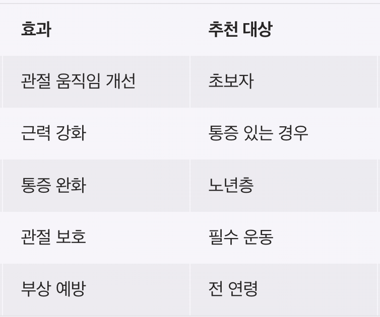 | 스트레칭 | 유연성 증가 | 부상 예방 | 전 연령 | 꾸준함 중요 |