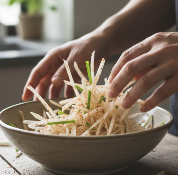고춧가루 물들이기부터 절임 생략까지, 무생채의 진짜 맛을 살리는 비법은?