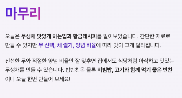 완성된 무생채는 실온에서 약 20~30분 정도 숙성시키면 양념이 잘 배어 더 맛있어집니다.