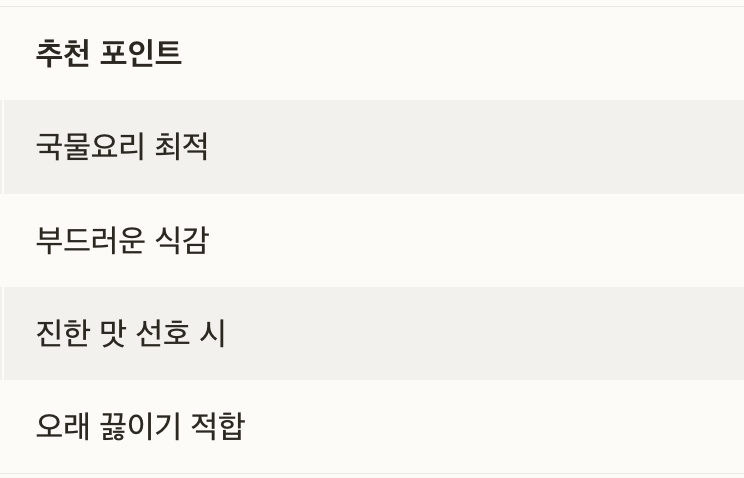| 사태 | 쫀득, 단단 | 오래 끓이기 적합 |