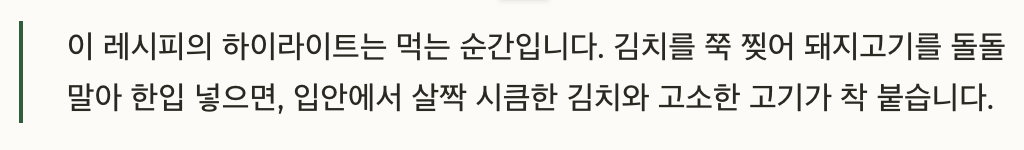 김치를 쭉 찢어 돼지고기를 돌돌 말아 한입 넣으면, 입안에서 살짝 시큼한 김치와 고소한 고기가 착 붙습니다.