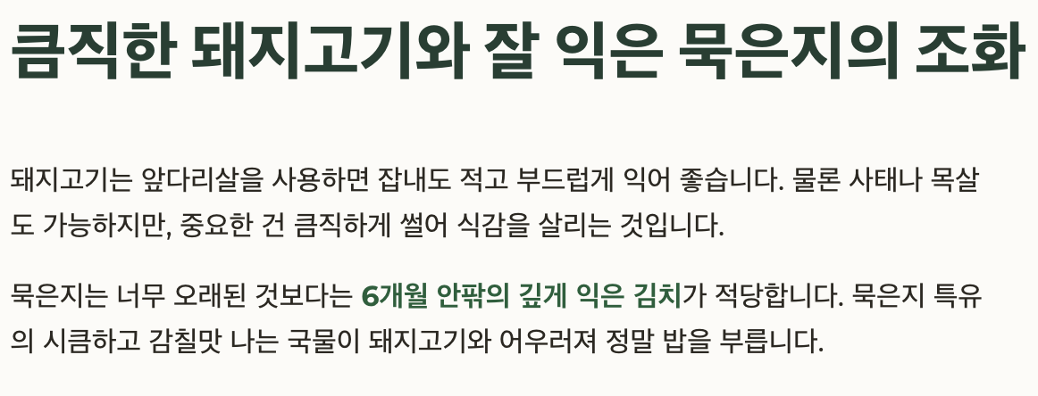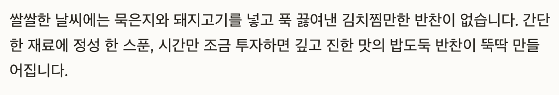 묵은지 특유의 시큼하고 감칠맛 나는 국물이 돼지고기와 어우러져 정말 밥을 부릅니다.