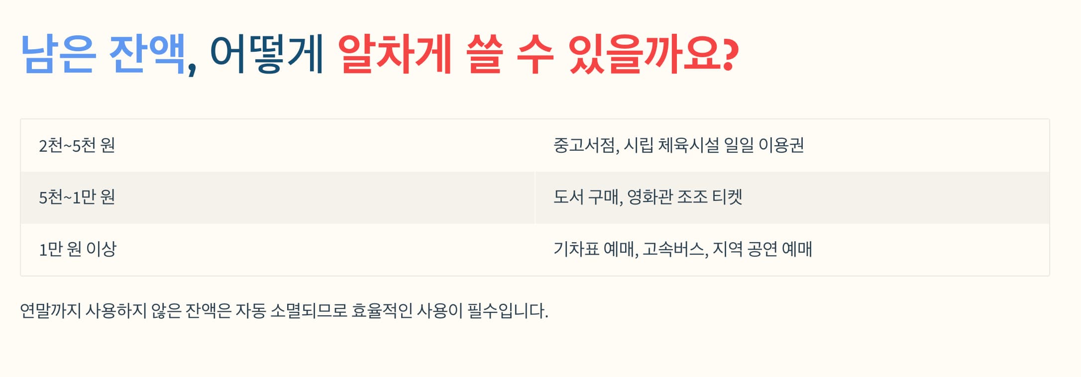 특히 애매하게 남은 금액을 소진하려면 저렴한 도서나 일일 체육시설 이용권,
