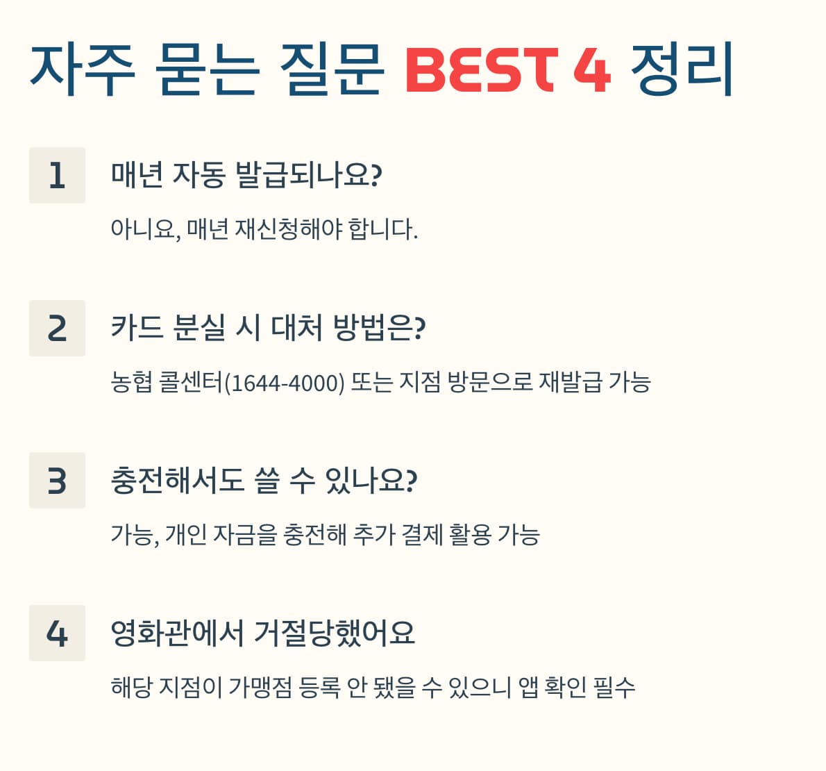| 카드 분실 시 대처 방법은? | 농협 콜센터(1644-4000) 또는 지점 방문으로 재발급 가능 |