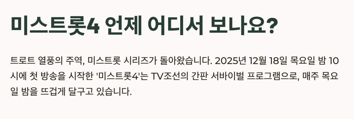 | 미스트롯4 참가자 명단 총정리! 주목할 신예는 누구? (0) | 2025.12.31 |