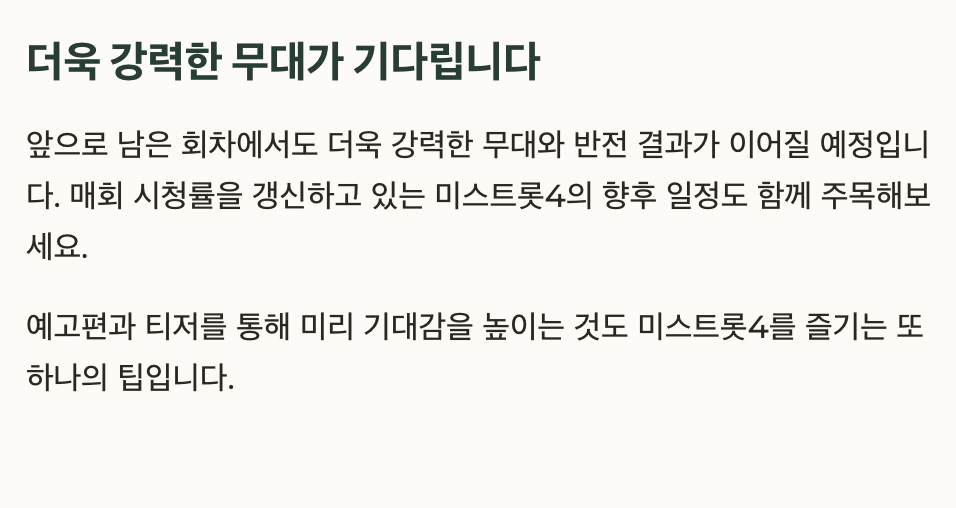 예고편과 티저를 통해 미리 기대감을 높이는 것도 미스트롯4를 즐기는 또 하나의 팁입니다.