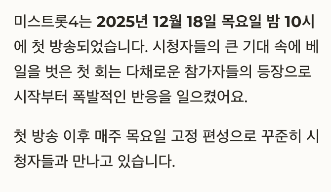 미스트롯4는 2025년 12월 18일 목요일 밤 10시에 첫 방송되었습니다.