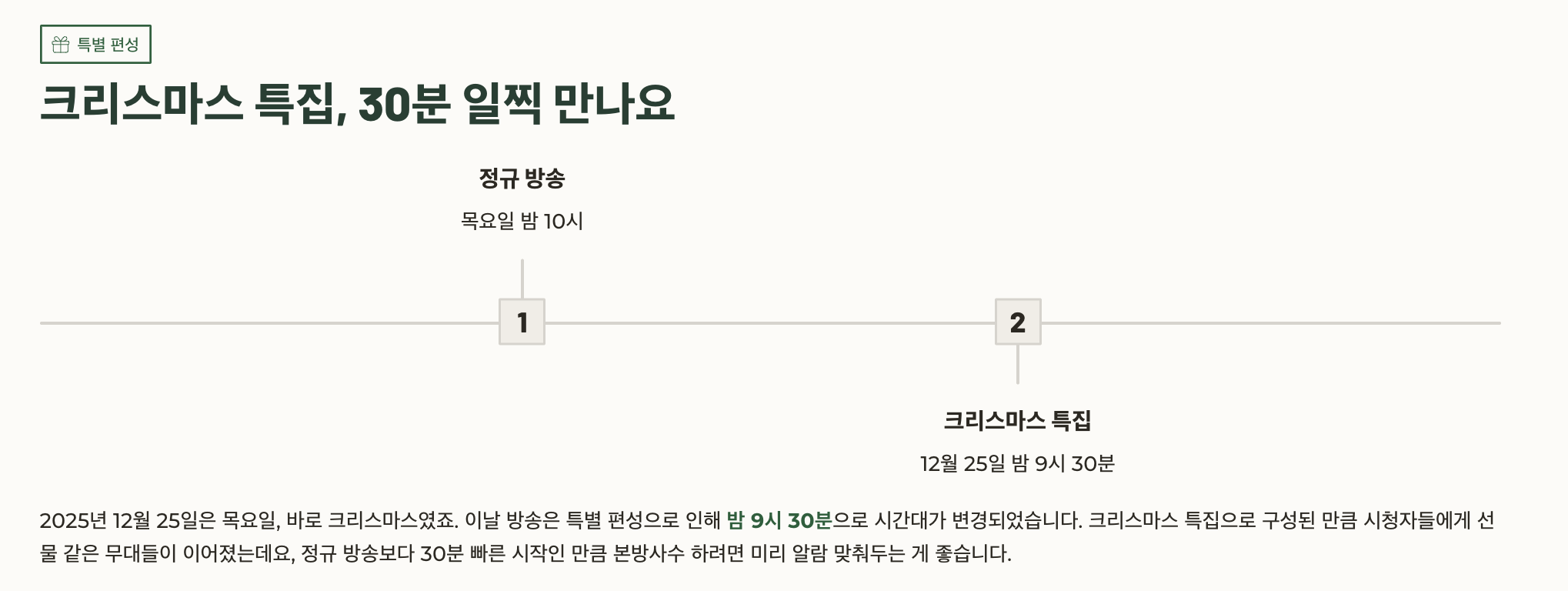 | 크리스마스 특집 방송시간 | 12월 25일 밤 9시 30분 |