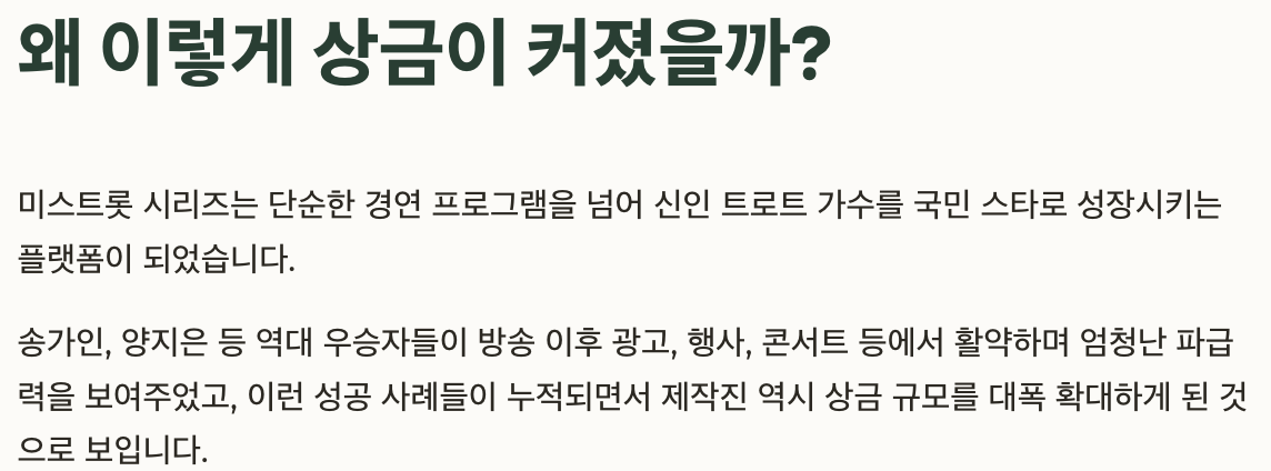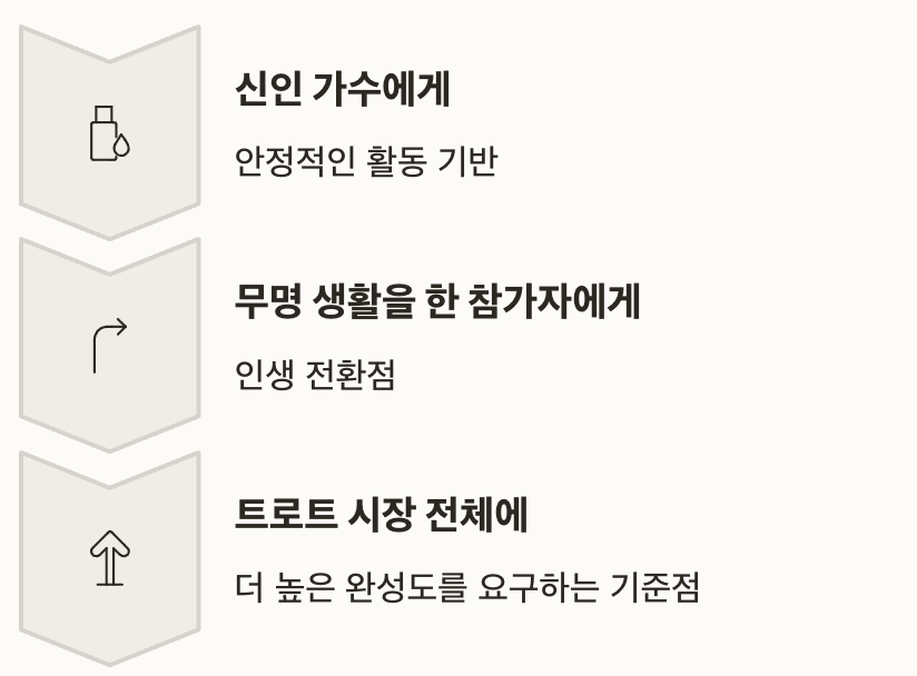 아니라, 실질적인 경제적 보상이 뒤따르기 때문에 참가자들의 각오와 무대 완성도가 더 높아질 수밖에 없습니다.