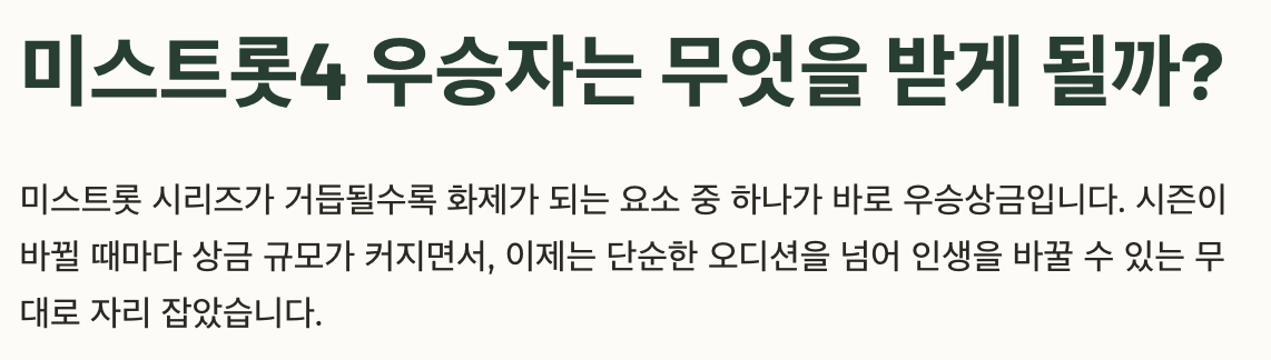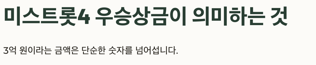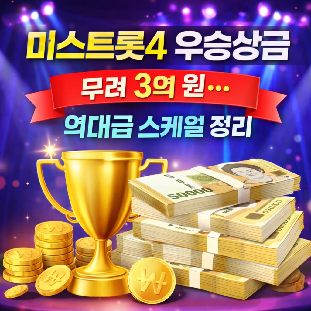 미스트롯 시리즈가 거듭될수록 화제가 되는 요소 중 하나가 바로 우승상금입니다. 시즌이 바뀔 때마다 상금 규모가 커지면서, 이제는 단순한 오디션을 넘어 인생을 바꿀 수 있는 무대로 자리 잡았는데요. 그렇다면 미스트롯4 우승상금은 얼마일까요? 지금부터 정확하게 정리해보겠습니다.