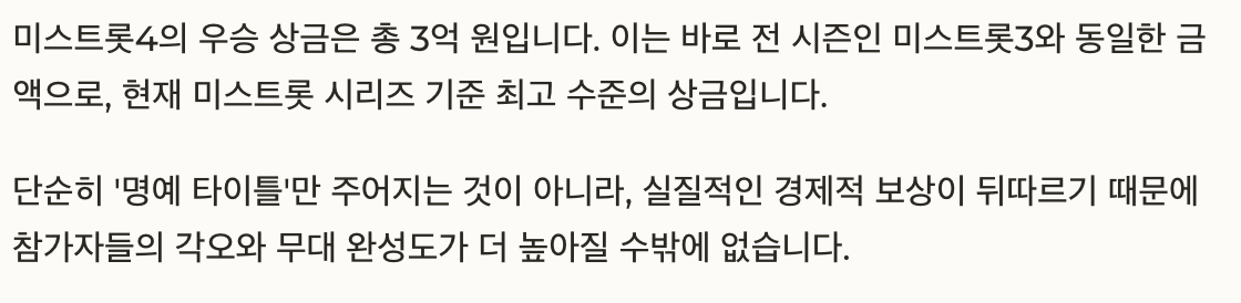 이는 바로 전 시즌인 미스트롯3와 동일한 금액으로, 현재 미스트롯 시리즈 기준 최고 수준의 상금입니다.