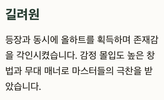 | 길려원 | 대학부 | 올하트 획득, 안정적인 무대력 |