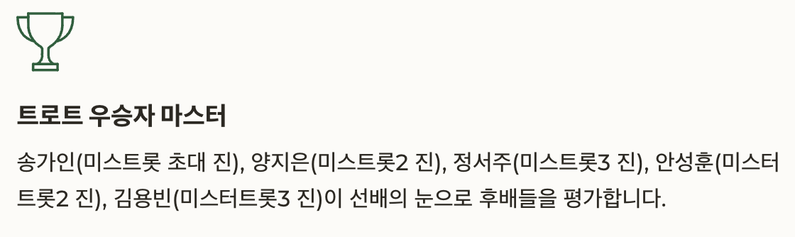미스트롯 초대 진 송가인, 미스트롯2 진 양지은, 미스트롯3 진 정서주가 마스터로 합류해 ‘선배의 눈’으로 후배들을 바라보고 있죠.