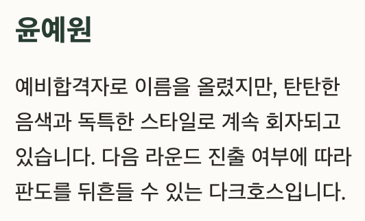 | 윤예원 | 대학부 | 예비합격자, 중저음 매력 |