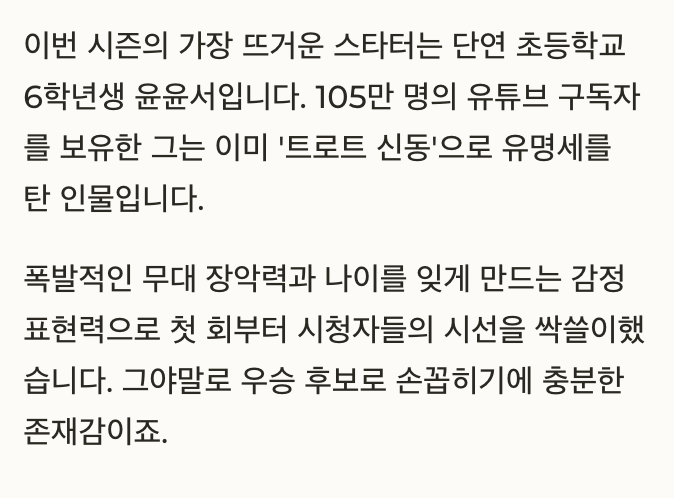 | 윤윤서 | 유소년부 | 105만 유튜브 구독자, 트로트 신동 |