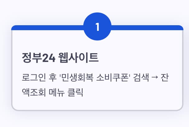 정부24에 로그인 후 ‘민생회복 소비쿠폰’을 검색하고 잔액조회 메뉴를 클릭하면 바로 확인 가능합니다.