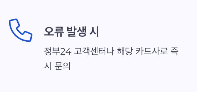 정부24 고객센터나 해당 카드사로 문의해 즉시 해결하는 것이 좋습니다.