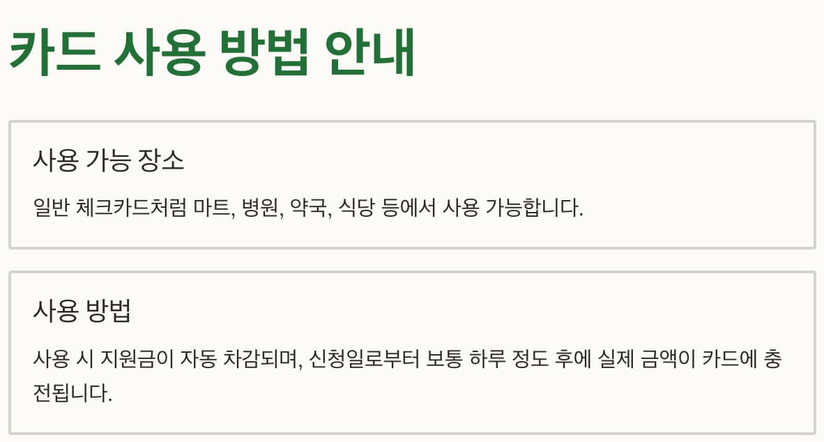 - 일반 체크카드처럼 마트, 병원, 약국, 식당 등에서 사용
