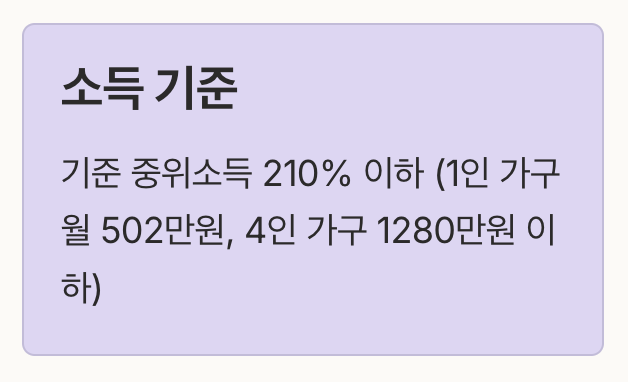 예를 들어 1인 가구는 월 502만 원, 4인 가구는 1280만 원 이하일 때 신청할 수 있습니다.