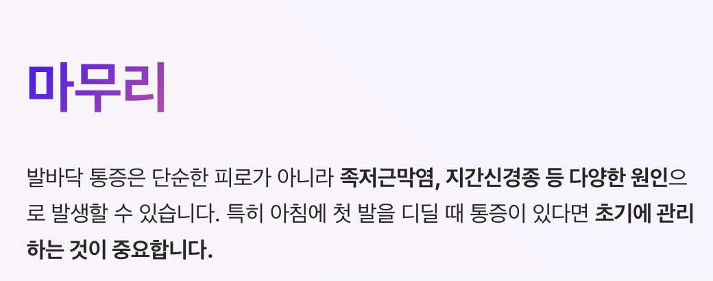 특히 아침에 첫 발을 디딜 때 통증이 있다면 발 건강에 문제가 생겼을 가능성이 있으므로 초기에 관리하는 것이 중요합니다.