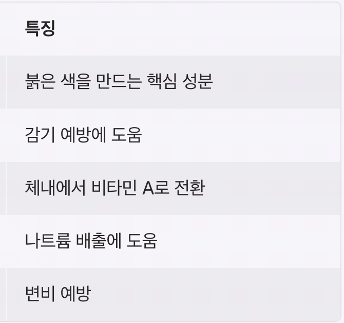 | 베타카로틴 | 눈 건강, 피부 보호 | 체내에서 비타민 A로 전환 |