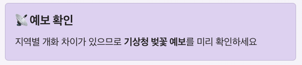 또한 지역에 따라 벚꽃 개화시기가 조금씩 차이가 있기 때문에 벚꽃 여행을 계획할 때는 기상청 벚꽃 예보를 확인하는 것이 좋습니다.