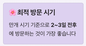 벚꽃은 개화 후 약 일주일 정도만 가장 아름다운 모습을 유지합니다. 강한 비나 바람이 불면 꽃이 빨리 떨어질 수 있기 때문에 만개 시기 기준으로 2~3일 전후에 방문하는 것이 가장 좋습니다.