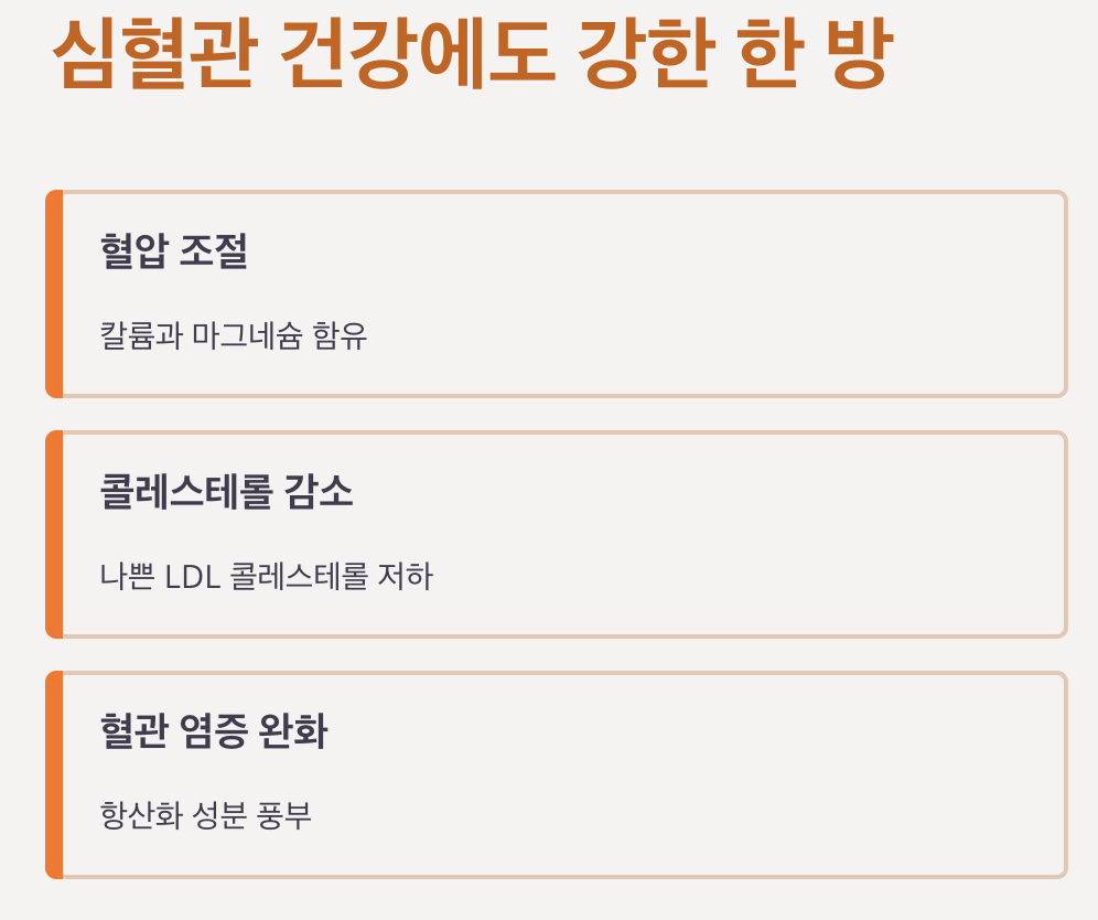 혈압 조절, 나쁜 콜레스테롤(LDL) 감소, 혈관 염증 완화에 기여합니다.