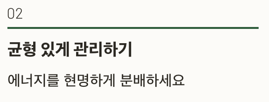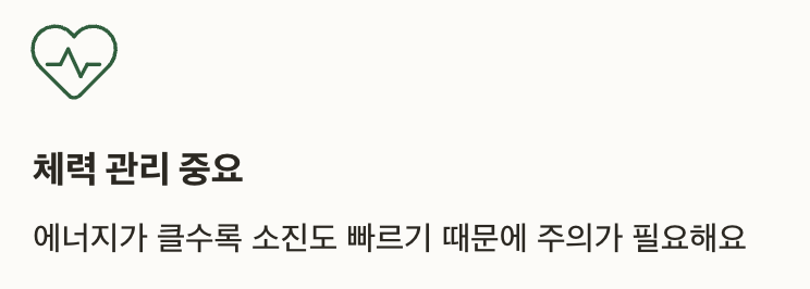 | 체력 관리 중요 | 에너지가 클수록 소진도 빠르기 때문에 주의 필요 |