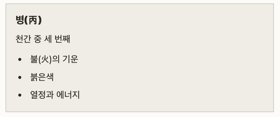 | 병(丙) | 천간 중 세 번째 | 불(火), 붉은색, 열정, 에너지 |