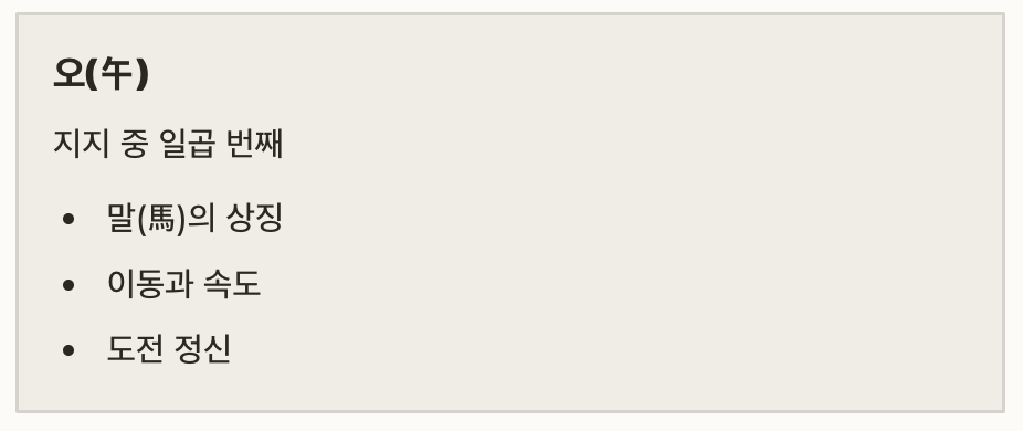 | 오(午) | 지지 중 일곱 번째 | 말(馬), 이동, 속도, 도전 |