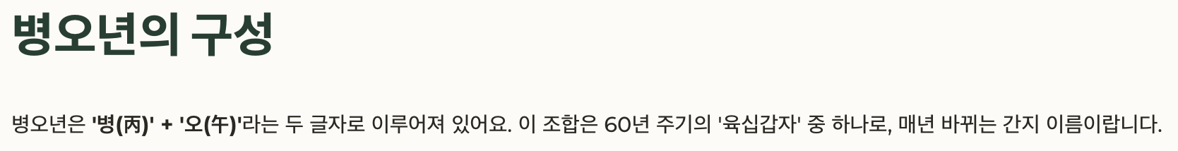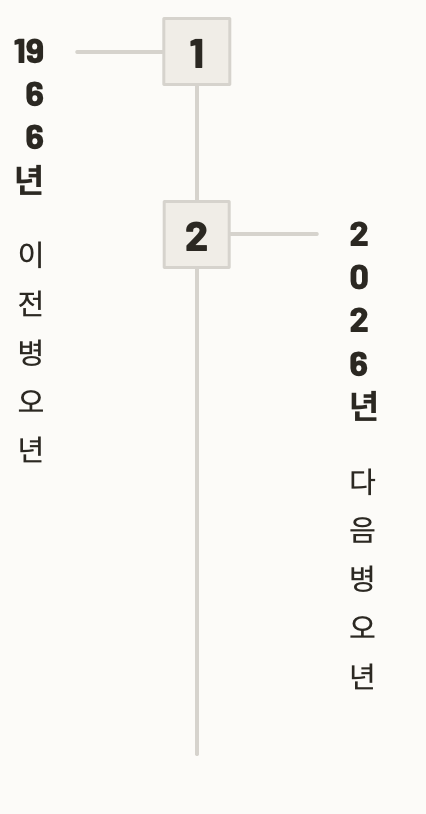 병오년은 ‘병(丙)’ + ‘오(午)’라는 두 글자로 구성돼요.