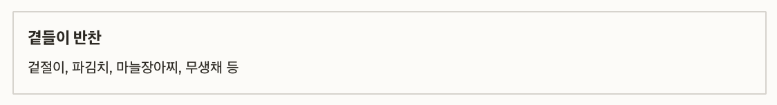 곁들이 반찬 겉절이, 파김치, 마늘장아찌, 무생채 등