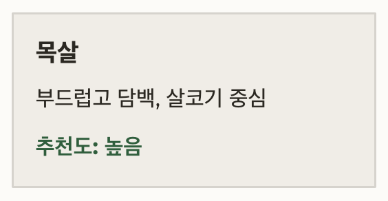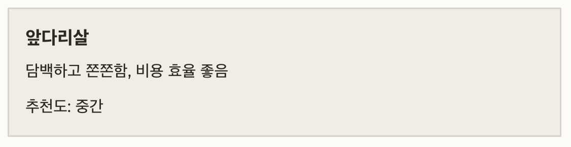 앞다리살 담백하고 쫀쫀함, 비용 효율 좋음 중간