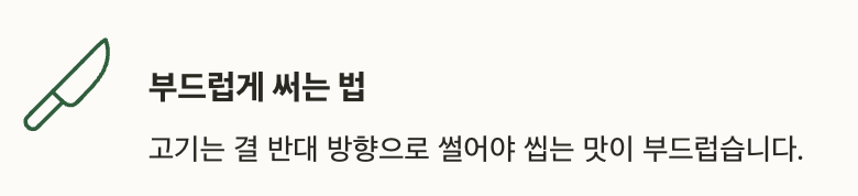 고기는 결 반대 방향으로 썰어야 씹는 맛이 부드럽습니다.