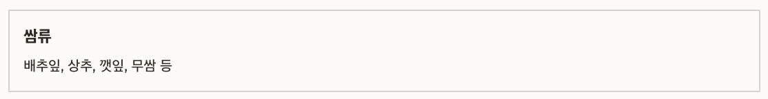쌈류 배추잎, 상추, 깻잎, 무쌈 등