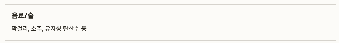 음료/술 막걸리, 소주, 유자청 탄산수 등