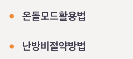 온돌 모드는 장시간 가동하는 경우가 많아 전기세와 가스비가 부담될 수 있죠. 이럴 때 예약 모드(2~3시간 간격 가동)를 활용하면 좋습니다. 일정 시간 동안 바닥을 데운 후 자동으로 꺼지기 때문에 과도한 난방을 방지하고 에너지를 절약할 수 있어요.