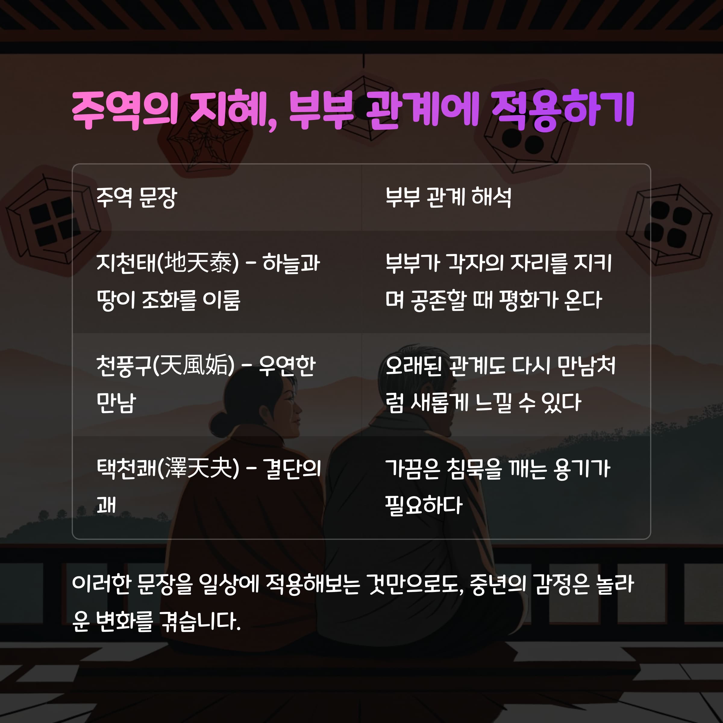 특히 부부 간의 갈등, 오해, 침묵을 해결하는 데 있어 '음양의 조화'라는 개념은 결정적인 실마리를 줍니다.