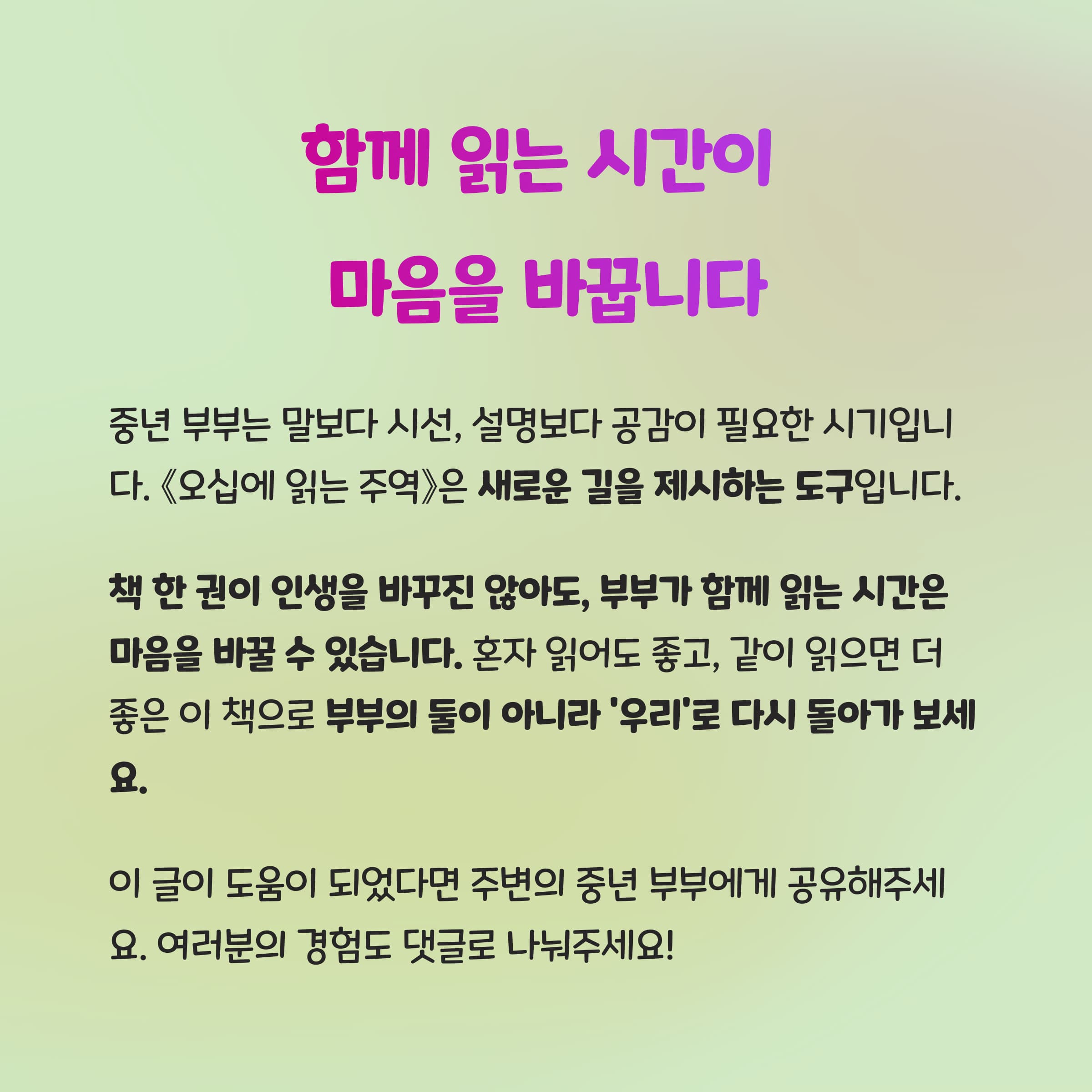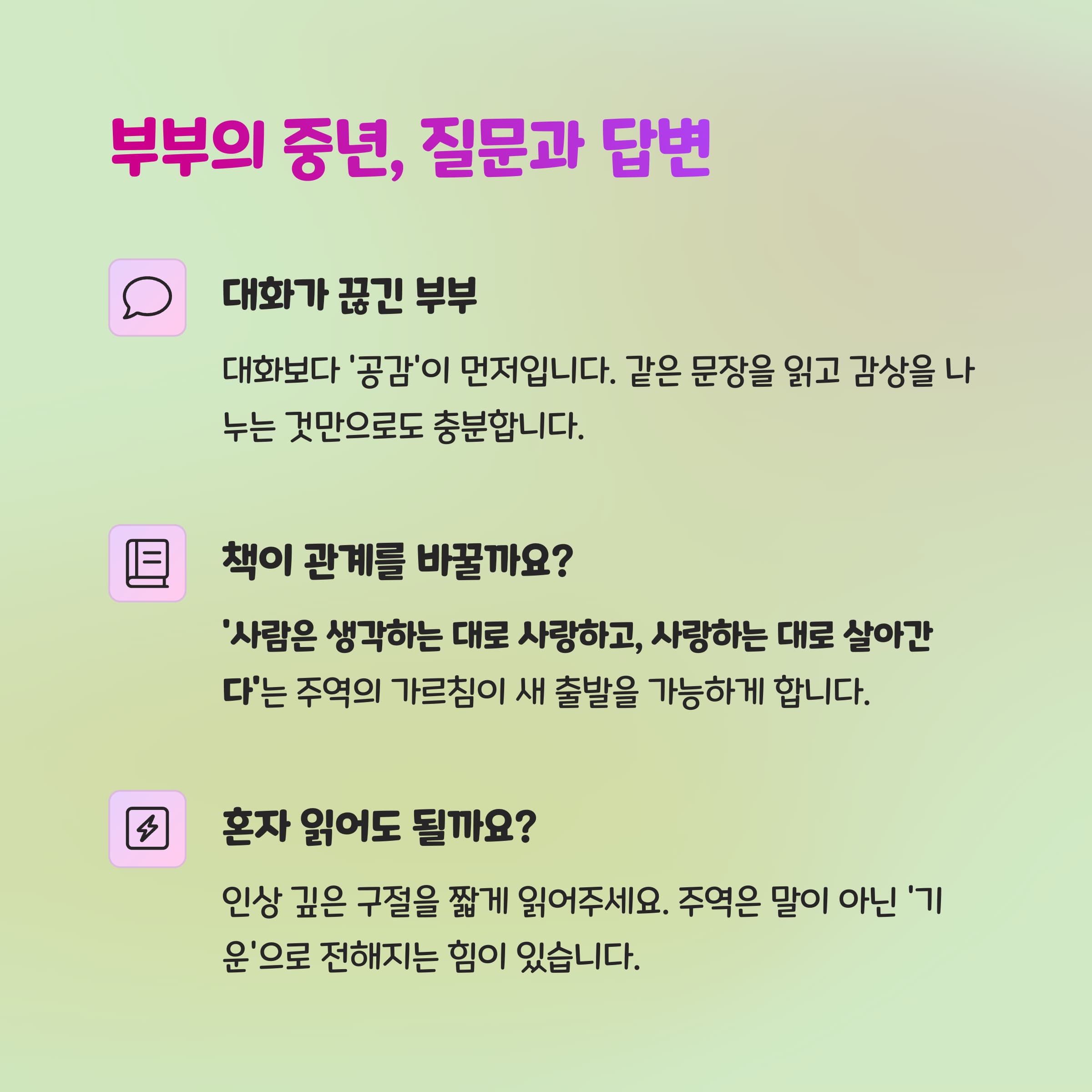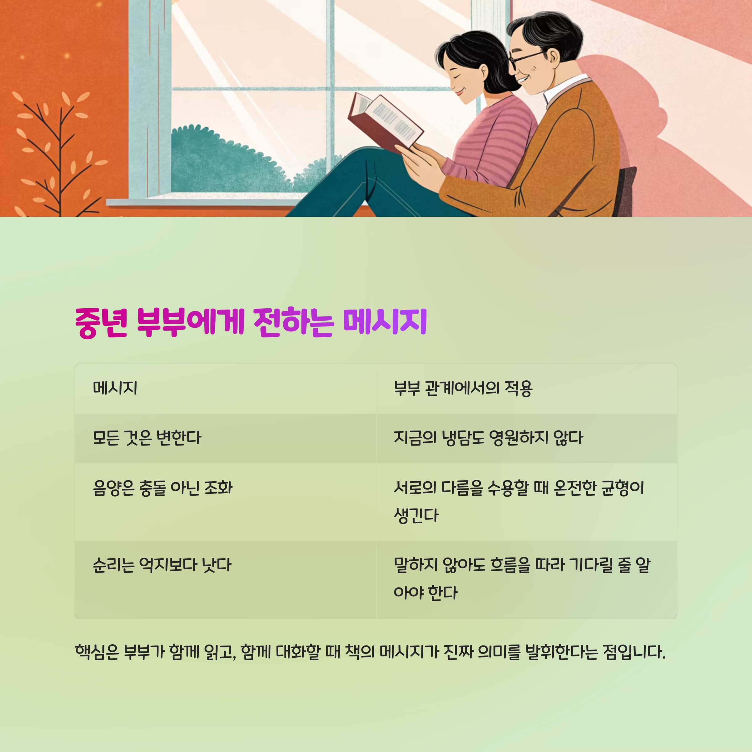 핵심은 부부가 함께 읽고, 함께 대화할 때 책의 메시지가 진짜 의미를 발휘한다는 점입니다.