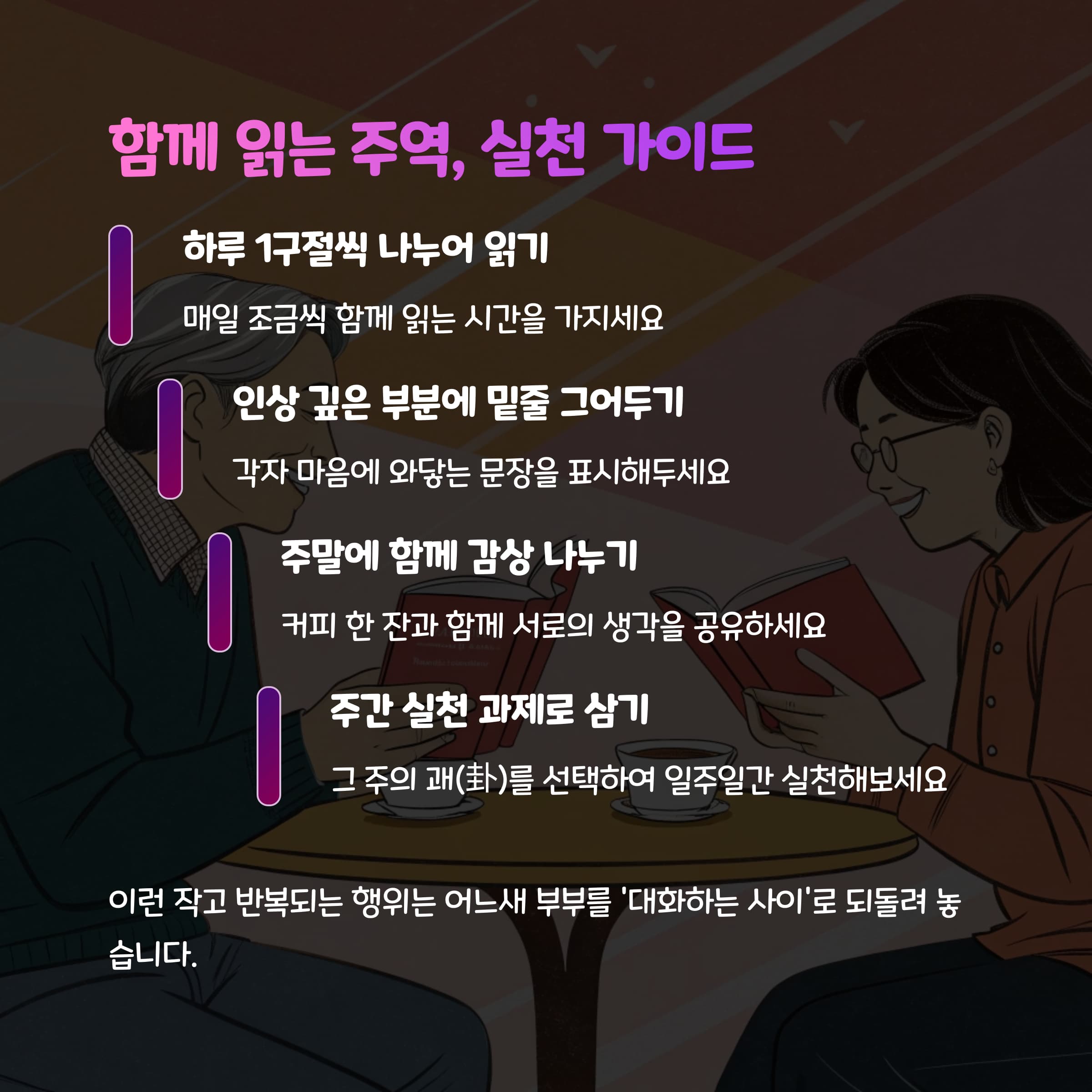 중년 부부가 《오십에 읽는 주역》을 제대로 활용하기 위해서는 아래와 같은 실천법이 필요합니다.