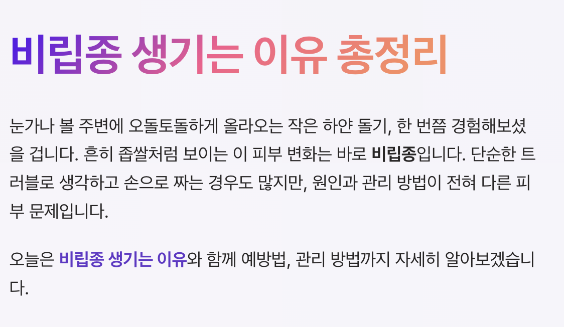 눈가나 볼 주변에 오돌토돌하게 올라오는 작은 하얀 돌기, 한 번쯤 경험해보셨을 겁니다. 흔히 좁쌀처럼 보이는 이 피부 변화는 바로 비립종입니다. 단순한 트러블로 생각하고 손으로 짜는 경우도 많지만, 사실은 원인과 관리 방법이 전혀 다른 피부 문제입니다.