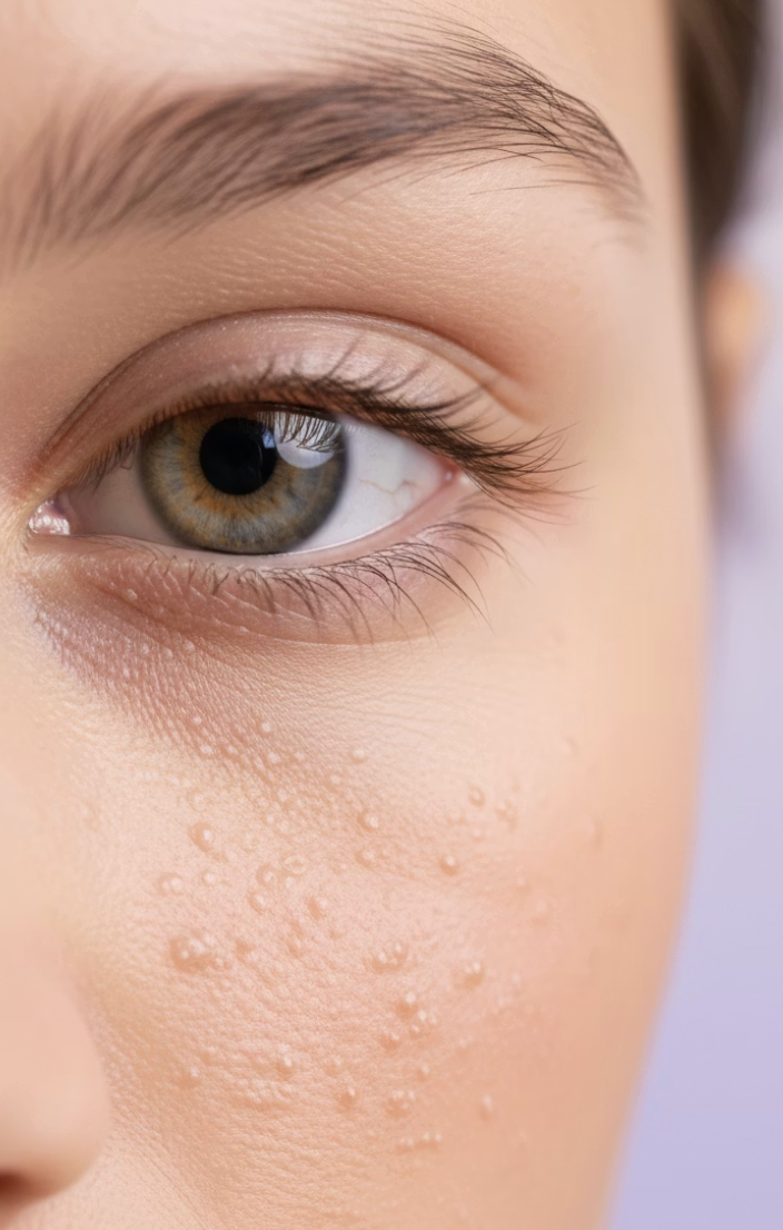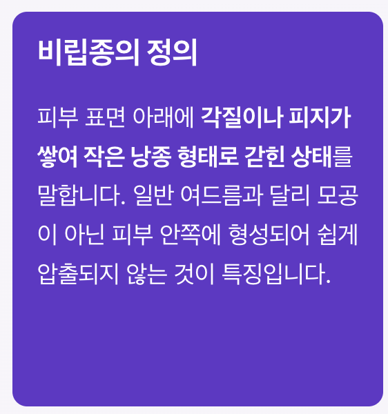 비립종은 피부 표면 아래에 각질이나 피지가 쌓여 작은 낭종 형태로 갇힌 상태를 말합니다. 일반 여드름과 달리 모공이 아닌 피부 안쪽에 형성되기 때문에 쉽게 압출되지 않는 것이 특징입니다.
