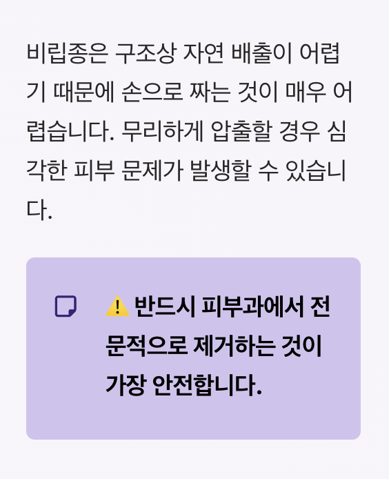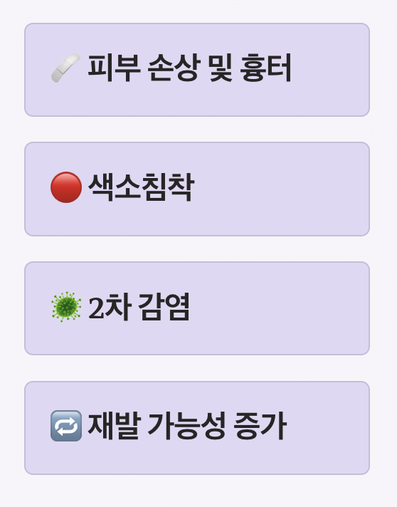 비립종은 구조상 자연 배출이 어렵기 때문에 손으로 짜는 것이 매우 어렵습니다. 무리하게 압출할 경우 다음과 같은 문제가 발생할 수 있습니다.