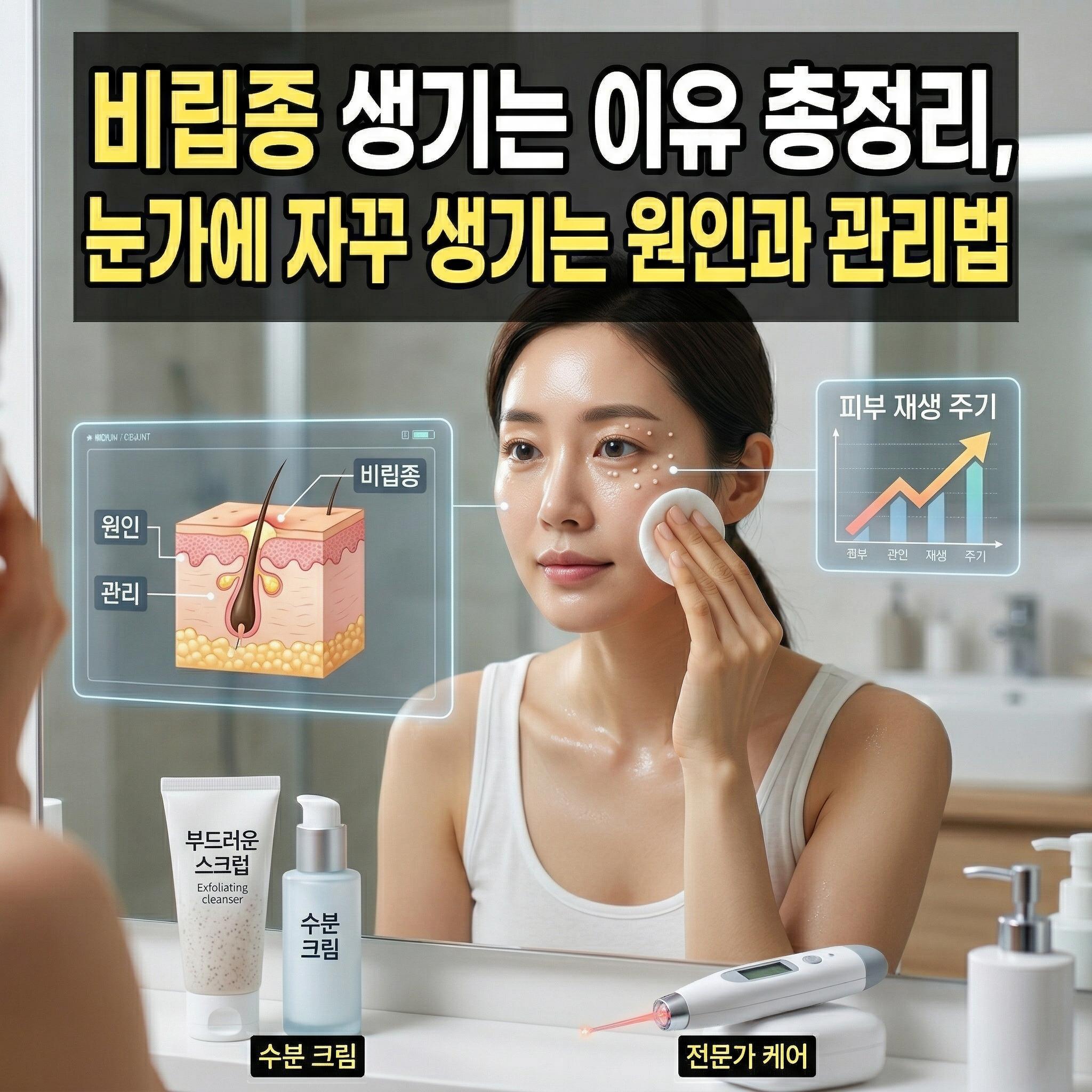 비립종 생기는 이유를 정확히 이해하고, 올바른 관리 방법을 실천하는 것이 깨끗한 피부를 유지하는 가장 좋은 방법입니다. 눈가처럼 민감한 부위일수록 더욱 세심한 관리가 필요합니다.