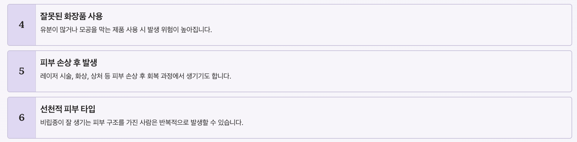 유분이 많은 화장품이나 모공을 막는 제품을 사용할 경우 발생 위험이 높아집니다.