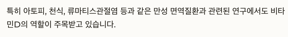특히 아토피, 천식, 류마티스관절염 등과 같은 만성 면역질환과 관련된 연구에서도 비타민D의 역할이 주목받고 있죠.