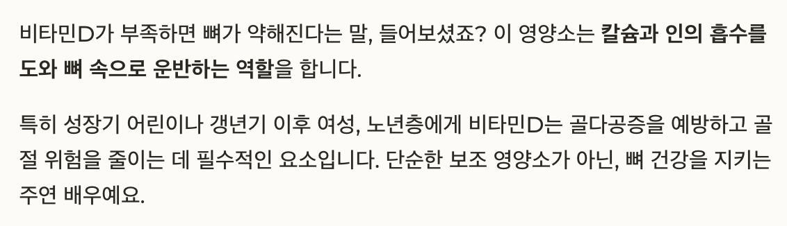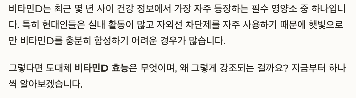 아쉽게도 실내 생활이 많은 현대인은 햇빛만으로는 비타민D를 충분히 채우기 어렵습니다.