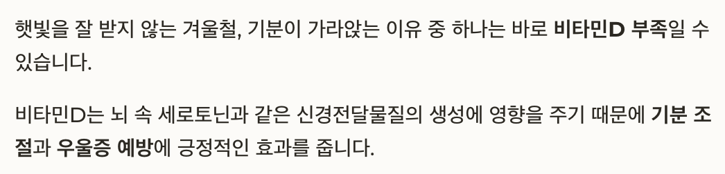 비타민D는 뇌 속 세로토닌과 같은 신경전달물질의 생성에 영향을 주기 때문에 기분 조절우울증 예방에 긍정적인 효과를 줍니다.